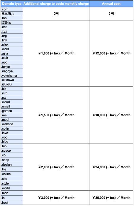 | Domain | include ※1 | additional cost | Additional charges often apply |